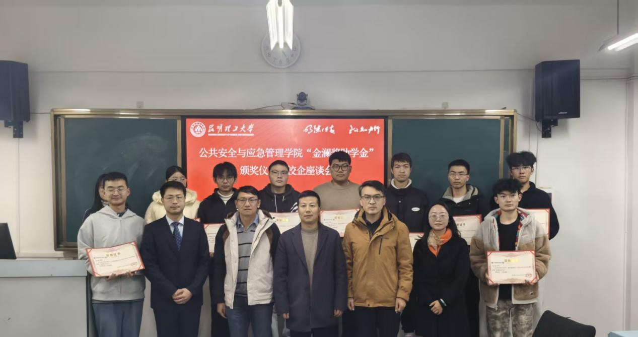 为支持昆明理工大学教育事业发展,推进安全工程专业建设和学科高质量发展,2026年1月7日下午,公共安全与应急管理学院召开金澜奖助学金颁奖仪式暨校企座谈会。云南金澜矿业集团有限公司总经理董金松、办公室主任谭昆,学院党委书记左红武、院长李克钢、党委副书记谷敏出席,获奖学生及学生干部代表参会。