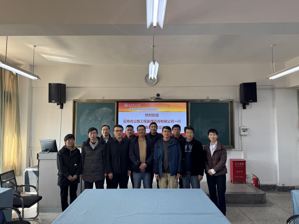 为深化校企合作,推动区域安全应急管理体系现代化,1月30日,云南省公路工程监理咨询有限公司党委委员、副总经理杨碧宇一行七位到访昆明理工大学公共安全与应急管理学院,双方举行合作交流座谈会,学院党政主要领导参加本次会议。